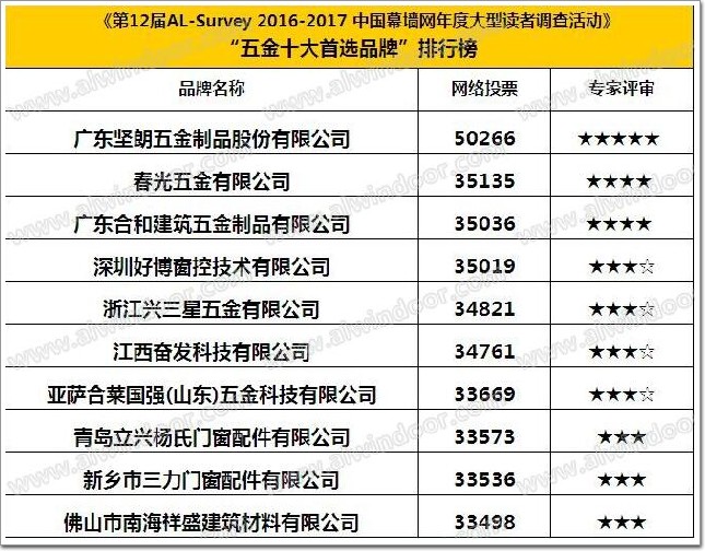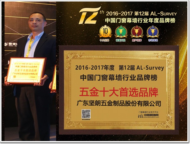 此外,在全國鋁門窗幕墻行業年會其間,還舉行了由中國建筑金屬結構協會主辦,中國幕墻網ALwindoor.com承辦的“第十二屆AL-Survey2016-2017中國幕墻網年度大型讀者調查暨‘我最喜愛幕墻工程’評選活動”的頒獎儀式,該活動自2005年創立以來,迄今已連續舉辦12屆,堅持“沒有黑馬,實至名歸”的評選風格,已成為廣大房地產開發商、設計院以及行業專家、顧問咨詢公司等讀者群體進行品牌選擇和產品選購的重要參考依據。而每屆的“我最喜愛幕墻工程”評選,更是以其“新、奇、高、大”的入圍標準,被喻為“魯班獎”的前哨站,堅朗最終以50266票力壓群雄,衛冕五金十大首選品牌冠軍。