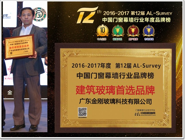 此外,在全國鋁門窗幕墻行業年會其間,還舉行了由中國建筑金屬結構協會主辦,中國幕墻網ALwindoor.com承辦的“第十二屆AL-Survey2016-2017中國幕墻網年度大型讀者調查暨‘我最喜愛幕墻工程’評選活動”的頒獎儀式,該活動自2005年創立以來,迄今已連續舉辦12屆,堅持“沒有黑馬,實至名歸”的評選風格,已成為廣大房地產開發商、設計院以及行業專家、顧問咨詢公司等讀者群體進行品牌選擇和產品選購的重要參考依據。而每屆的“我最喜愛幕墻工程”評選,更是以其“新、奇、高、大”的入圍標準,被喻為“魯班獎”的前哨站,金剛玻璃不負眾望以19492票獲得建筑玻璃類首選品牌大獎。