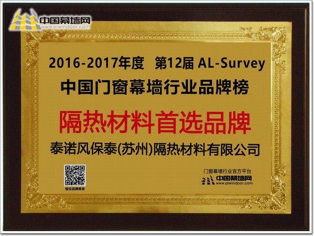 此外,在全國鋁門窗幕墻行業年會其間,還舉行了由中國建筑金屬結構協會主辦,中國幕墻網ALwindoor.com承辦的“第十二屆AL-Survey2016-2017中國幕墻網年度大型讀者調查暨‘我最喜愛幕墻工程’評選活動”的頒獎儀式,該活動自2005年創立以來,迄今已連續舉辦12屆,堅持“沒有黑馬,實至名歸”的評選風格,已成為廣大房地產開發商、設計院以及行業專家、顧問咨詢公司等讀者群體進行品牌選擇和產品選購的重要參考依據。而每屆的“我最喜愛幕墻工程”評選,更是以其“新、奇、高、大”的入圍標準,被喻為“魯班獎”的前哨站,泰諾風保泰眾望所歸以超高人氣,以及得來自行業專家、幕墻設計院和顧問公司20名專業評委超高評價,最終以26317票衛冕隔熱材料首選品牌榜首。