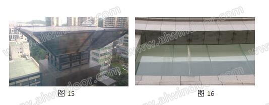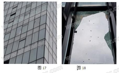 隱框玻璃幕墻是采用建筑結(jié)構(gòu)密封膠進(jìn)行結(jié)構(gòu)裝配的一種玻璃幕墻,合格的隱框玻璃幕墻通常不可能有玻璃墜落的安全問(wèn)題。由于受人工操作和環(huán)境因素,或經(jīng)過(guò)火災(zāi)等高溫下使用的影響,隱框玻璃幕墻的玻璃粘接性能往往達(dá)不到設(shè)計(jì)的最好性能,但通常不會(huì)影響玻璃幕墻的正常使用。造成隱框幕墻玻璃有可能脫落的最主要原因之一在于施工單位和中空玻璃生產(chǎn)廠(chǎng)家在制作隱框玻璃幕墻時(shí),采用不合格的硅酮結(jié)構(gòu)密封膠或非結(jié)構(gòu)密封膠(一般的密封膠或聚硫膠)進(jìn)行玻璃的結(jié)構(gòu)性粘接,從而導(dǎo)致隱框玻璃幕墻玻璃整片的脫落和下墜(圖14);其次就是施工單位沒(méi)有嚴(yán)格按照《玻璃幕墻工程技術(shù)規(guī)范》JGJ-102的要求制作和安裝隱框玻璃幕墻,輔材與硅酮結(jié)構(gòu)密封膠不相容、基材表面處理不正確等。