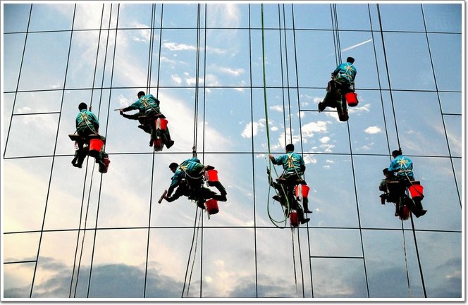 傳統人工清洗方式 圖片來源:門窗幕墻行業攝影大賽