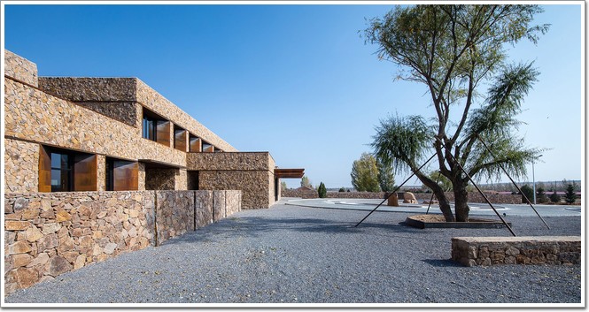 最后則是建筑的外觀,外部簡潔粗獷,與周邊天然遼闊的地理環境相呼應。設計師嘗試用現代的設計語言來闡述設計本身,整座建筑使用了具有鮮明特征的當地石材和耐候鋼板,以石筑墻,是向敖漢上古先民致敬,以鋼為材,是向鑌鐵的契丹致意。而石頭材料則來自于敖漢當地,源于基座建設時挖掘而出的石塊,將這些石塊鑲嵌于墻體,既消化了富余的土方量又產生出原汁原味的鄉土景觀。山劈石呈赭石色,有黃色和灰色的花紋,石頭表面肌理豐富,凹凸明顯,表情粗獷,充分模擬了自然,賦予建筑粗獷的美。