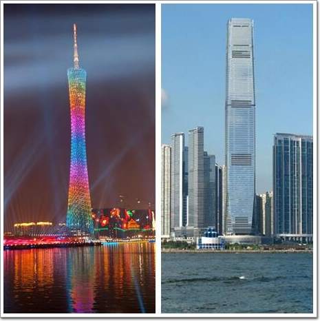 左:廣州“小蠻腰”(600m) 右:香港環(huán)球貿(mào)易廣場(484m)