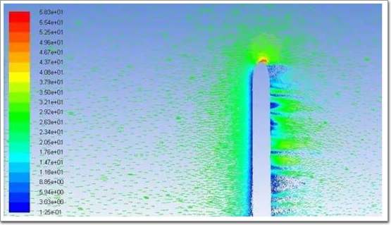 上圖,我們可以看到在建筑后方有漩渦脫落的想象,通過數(shù)值模擬能夠捕捉到這種流場現(xiàn)象。這也是數(shù)值模擬優(yōu)于風(fēng)洞試驗的地方。