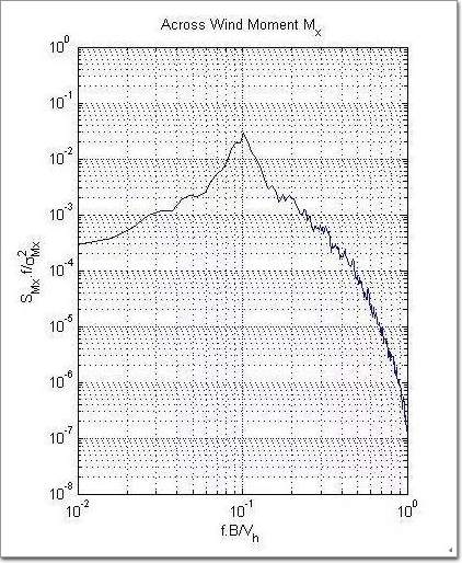 上圖給出了典型的脈動響應(yīng)的功率譜,那個尖峰就是屬于共振響應(yīng)的。尖峰對應(yīng)的頻率就是結(jié)構(gòu)的固有頻率。對上面功率譜在頻域上積分便得到脈動響應(yīng)的均方差。