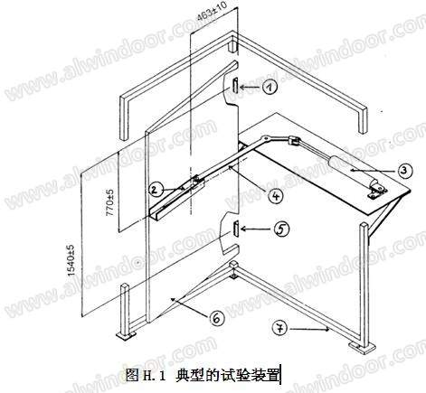 試驗裝置應配備有適當的鋼板,,鋼板的安裝應保證重心位置與兩合頁的合頁片上的安裝孔是等距的。合頁的旋轉軸應與扇的豎直平面平行(見圖H.2)。