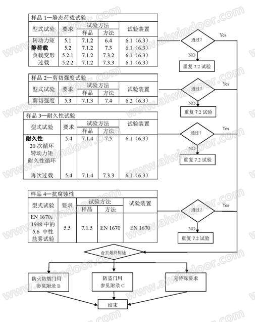 應提供12個合頁。其中5個用于7.1.2到7.1.5所規定的試驗中(見附錄J的流程表)。如果合頁不能滿足所有適當的接收標準,那么應繼續從原始樣本(原來的12個樣品(只剩5個了的))中抽樣并按照7.2要求進行重新試驗。