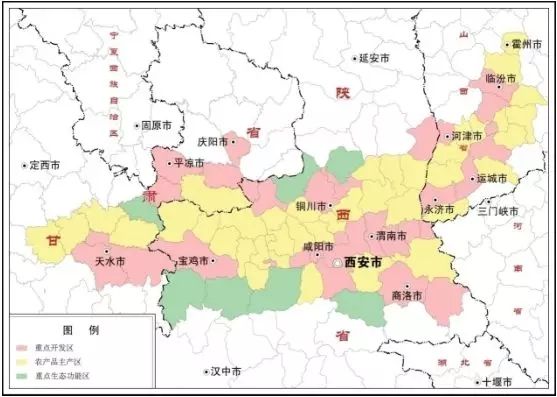 陜西。西安、寶雞、咸陽、銅川、渭南 5 個市、楊凌農業高新技術產業示范區及商洛市的商州區、洛南縣、丹鳳縣、柞水縣;