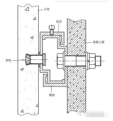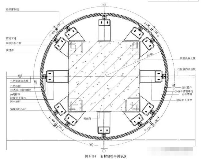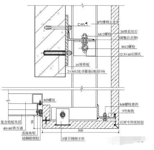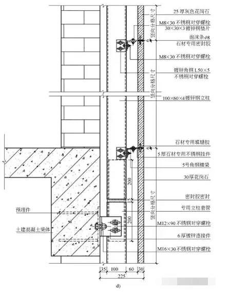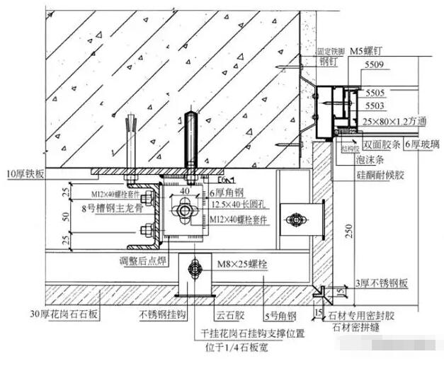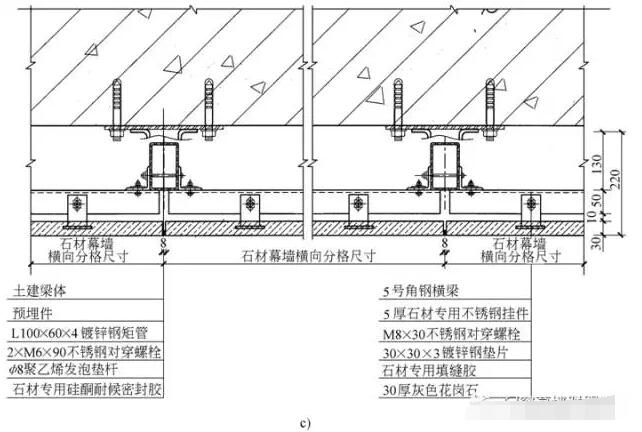 圖3-120 玻璃幕墻與石材幕墻包梁部位連接節點