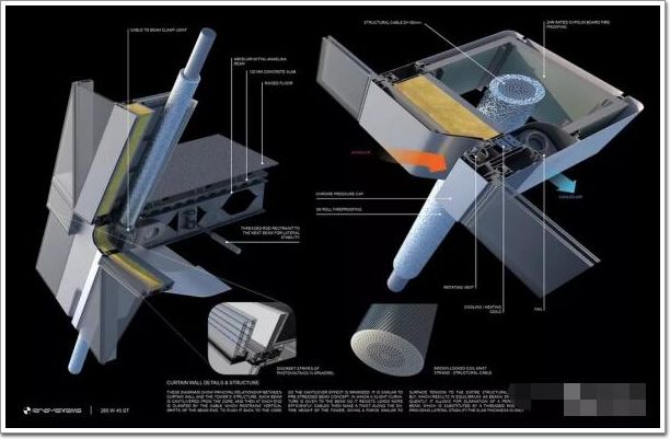 建筑物的外墻采用參數化軟件編寫,成對的三角形面板環繞在一起形成塔樓的曲面。電纜內部的盒子集成了軟件控制的旋轉通風口,用于自然通風和空調,而高性能玻璃涂層可阻止過熱增益。