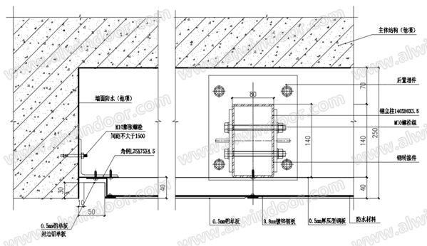 由于不考慮保溫與內(nèi)裝的效果,此體系并不是常規(guī)的做法,需要引起重視的是金屬鎖扣板與周邊混凝土的交接處理方式,如處理不好其交接位置極易出現(xiàn)漏水,我們的處理方式是在砌體上先做沙漿及SBS防水涂料,鎖扣板的防水卷材在邊部與內(nèi)層防水層搭接,但由于是舊樓改造項(xiàng)目,原結(jié)構(gòu)混凝土表面平整度較差,與金屬鎖扣板之間如果采用對(duì)口的方式無(wú)法實(shí)現(xiàn)比較美觀的效果。通過(guò)與建筑師的交流,確定在邊部預(yù)留50mm的槽口,金屬板內(nèi)嵌,這樣既可解決混凝土不整齊的收口問(wèn)題,又能解決防水層搭接的處理問(wèn)題。具體做法見(jiàn)下圖4.1.1: