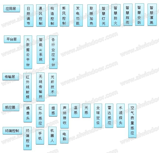 我們把智能化分為四層,在具體看看在幕墻門窗中應(yīng)用到幾層。以下是智能化建筑幕墻的層級(jí) :
