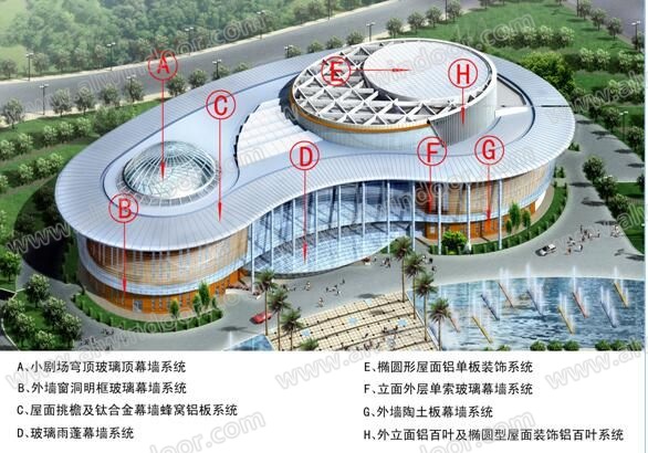 常州大劇院建筑幕墻工程幕墻面積約為43000平方米,按幕墻形式區分主要為陶土板幕墻系統、傾斜式不銹鋼單向索承玻璃幕墻系統、隱框玻璃采光穹頂幕墻系統、全玻幕墻系統、鈦合金(詞條“鈦合金”由行業大百科提供)蜂窩鋁板幕墻系統、肋點式玻璃幕墻系統、隱框窗玻璃幕墻系統、橢圓形單層鋁板屋面幕墻系統、蜂窩鋁板挑檐幕墻系統、點式玻璃雨蓬系統等(圖2)。