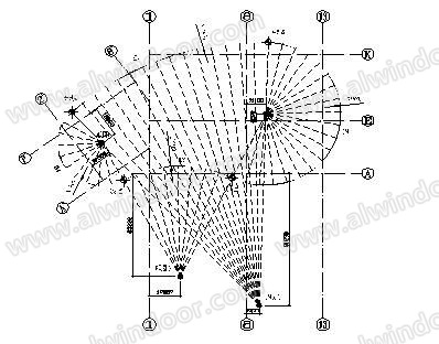 常州大劇院建筑總平面由四段不同半徑的圓弧組成,在圓心點固定的基礎上,不同的建筑標高位置其半徑亦有所不同(圖3),隨建筑標高的增加其半徑也隨之增加。由于建筑立面造型及建筑藝術效果表現的需要,外維護采用了單層單向(豎向)不銹鋼拉索幕墻,建筑造型決定了其外傾斜式的構造特點。