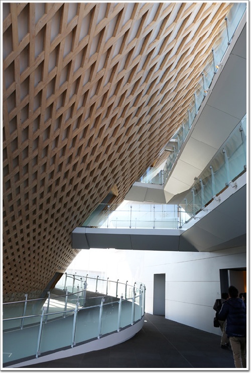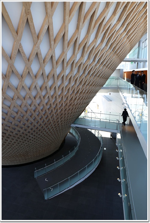 實際上,這些倒圓錐型建筑物墻面,是使用了8000枚木板鑲嵌而成形成木質幕墻系統,而木料則來自于富士山麓的絲柏樹。如編織物般交叉組合的木板表面打磨得十分圓潤,觸感非常光滑。