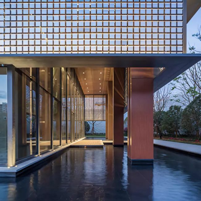 上海龍湖天鉅展示區,本項目做為顓橋地塊的展示區,外立面采用通透的玻璃幕墻與金屬色風鈴幕墻相結合,軸線西側采用光面和亞光面(詞條“亞光面”由行業大百科提供)摩卡石石材開放式錯縫拼接,主入口采用向里層層疊退的疊禮門。旨在打造傳承人文意蘊,營造都市書院的氛圍。