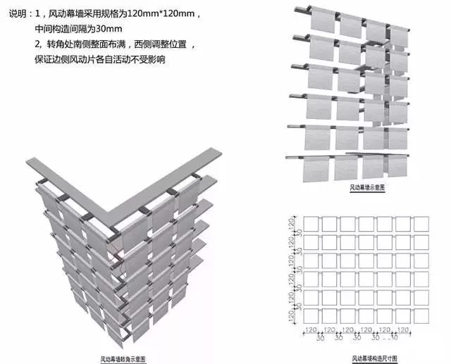 本項目南立面風鈴幕墻后為豎明橫隱玻璃幕墻,系統上考慮將風鈴幕墻的龍骨連接在玻璃幕墻的立柱上,即通過8mm的不銹鋼轉接件連接幕墻立柱與風鈴幕墻定制的異形角鋼(詞條“角鋼”由行業大百科提供)龍骨,風鈴片不銹鋼機制螺釘進行左右限位,并且通過螺釘與風鈴片開孔的配合進行風鈴片擺動角度的限位。風鈴片采用120*120*0.8mm陽極氧化鋁合金板。