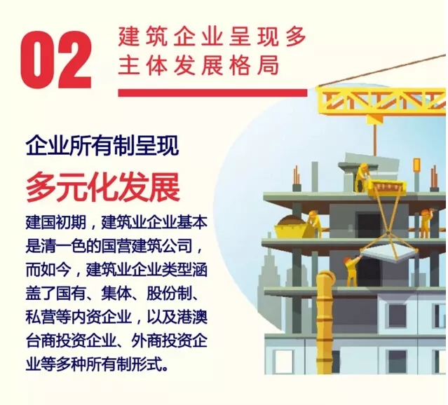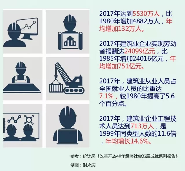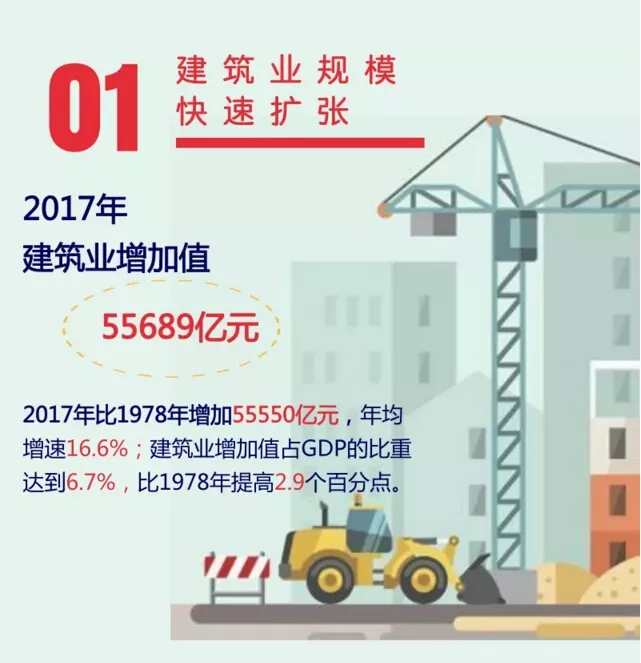 改革開放40年來,我國建筑業(yè)保持快速發(fā)展,規(guī)模明顯擴大,呈現(xiàn)多主體發(fā)展格局,實力和貢獻明顯提高,對外開放度明顯提高,從建筑業(yè)大國不斷走向建筑業(yè)強國。下面就用一系列圖表展示改革開放40周年建筑業(yè)取得的卓越成果。