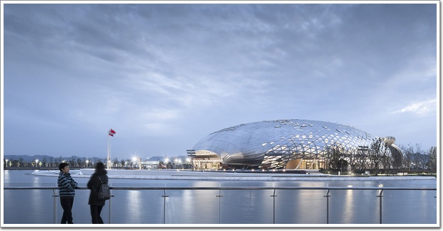 整體設(shè)計以“擊云破曉,鳳舞九天”為意向,建筑猶如一朵潔白的祥云,朦朧透光,靜臥于鳳棲湖中,與周邊的靜謐湖水渾然一體。覆以曲園路上的立體金屬鏤空屋頂猶如“騰空而起的飛鳳”一般展翅高飛,充滿詩意。