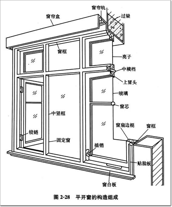 窗由窗框、窗扇和五金零件組成。窗框為為固定部分,由邊框、上框、下框、中橫框和中豎框構成;窗扇為活動部分,由上冒頭,下冒頭、邊梃、窗芯及玻璃構成;五金零件及附件包括鉸鏈、風鉤、插銷和窗簾盒、窗臺板、筒子板、貼臉板等。下圖是平開窗的構造組成。