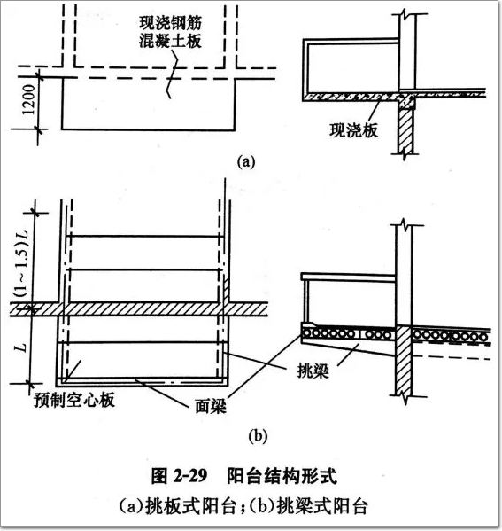 陽臺形式很多,在使用方面,有生活陽臺、服務陽臺。生活陽臺供生活起居之用,服務陽臺為從事家務活動等用。而陽臺結構形式有挑板式陽臺和挑梁式陽臺兩種,見下圖。