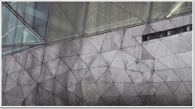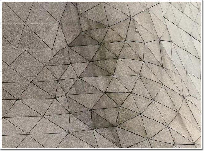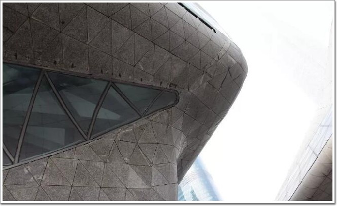 三角形拼合的石板應該說能適應更多的異形體塊,但對于不規則弧形轉折的體塊來說可能真是一場噩夢!對比一下采用金屬薄皮、GRC的異形體塊建筑,不得不說,外層石板幕墻是一個錯誤的選擇,不知道是建筑師的主動堅持還是迫不得已的選擇?