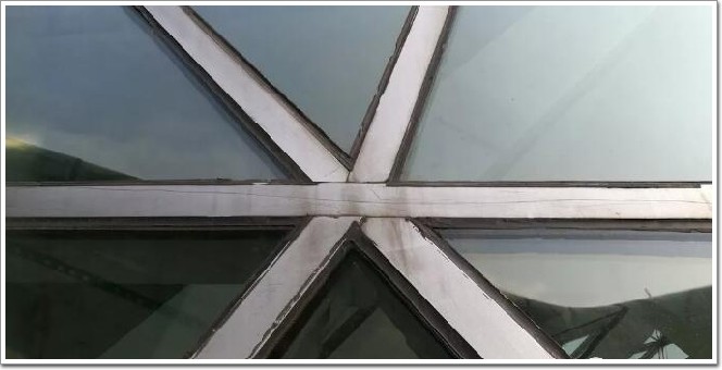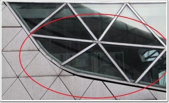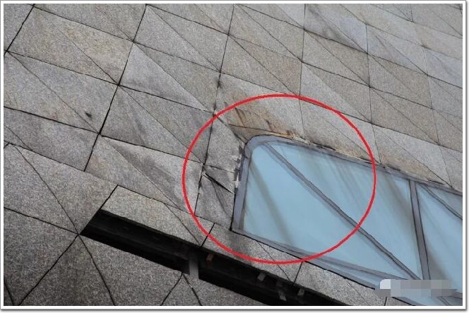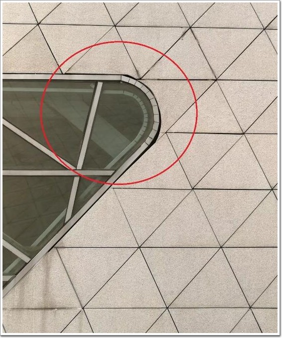 窗框與石板幕墻的縫隙寬窄不一,某些弧形窗框更是簡單粗暴,甚至是直接剪切開直線拼接!