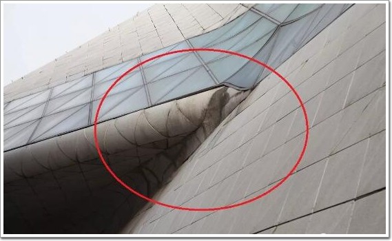 可見建筑外層幕墻也就是2009年左右施工的,這個時候,我們已經建成了舉世聞名的奧運鳥巢、水立方等等建筑,按說施工技術水平已經達到一定高度了。