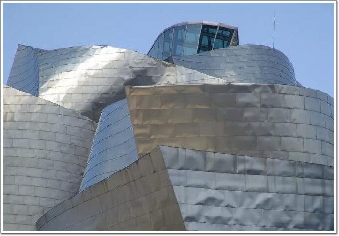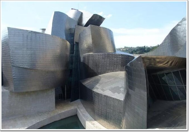 弗蘭克·蓋里(Frank Gehry)設計的位于西班牙畢爾巴鄂的鄂古根海姆博物館,同樣是異形體塊,由于薄皮金屬鈦板的使用反而為建筑更添魅力。