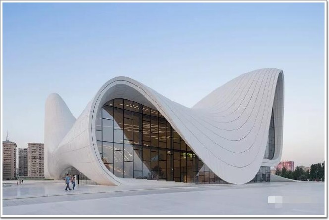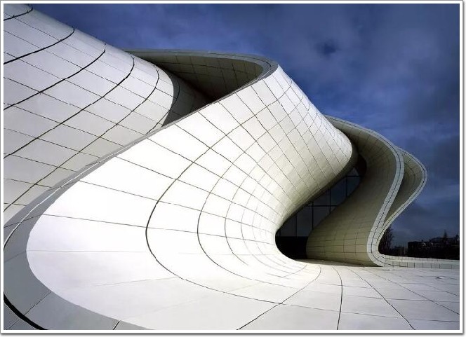 同樣是扎哈設計的、2012年完工的、位于阿塞拜疆巴庫的阿利耶夫文化中心,由于采用了更易于加工成異形、板塊大小可控的人造GRC及GFRP板塊,建筑整體顯得更為精致,板塊分格也完美地適應了異形體塊。(圖片來源于點擊查看 http://www.zaha-hadid.com/)