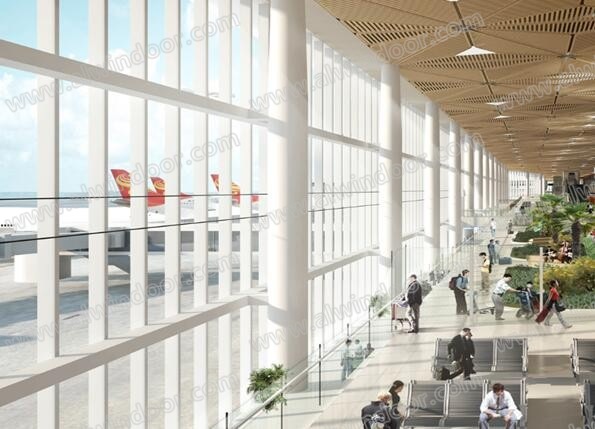 F、出入口門套(詞條“門套”由行業大百科提供)及雨蓬幕墻系統,F1子系統:陸側三層連橋門斗及玻璃雨蓬、首層地下服務車道出入口雨蓬, F2子系統:陸側中心區首層鋁板門斗,F3子系統:首層陸側和空側VIP雨蓬,F4子系統:中心區登機口門套, F5子系統:陸側中心區二層入口玻璃廳幕墻;