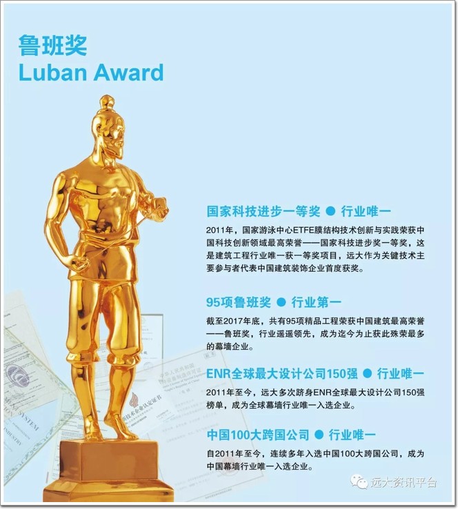 遠大公司共有95項精品工程榮獲中國建筑最高榮譽——魯班獎,成為迄今為止獲此殊榮最多的幕墻企業。2011年,國家游泳中心ETFE膜結構技術創新與實踐榮獲中國科技創新領域最高榮譽——國家科技進步獎一等獎,這是建筑工程行業唯一獲一等獎項目,遠大公司作為關鍵技術單位代表中國建筑裝飾企業首度獲獎。