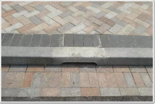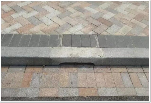 地面鋪裝排水的順暢是涉及到工程質量和使用功能的關鍵部位;設置地表排水口根據地面的排水坡度和標高設置,排水位置設置在最低點,蓋板相對于周邊的鋪裝底5mm左右;地面的排水口作為整體鋪裝的統一,施工的工藝和要求非常高:收邊處理非常精細,如圖所示:材料切割的對稱,和周邊材料的拼接,都可作為施工的細部重點對待。