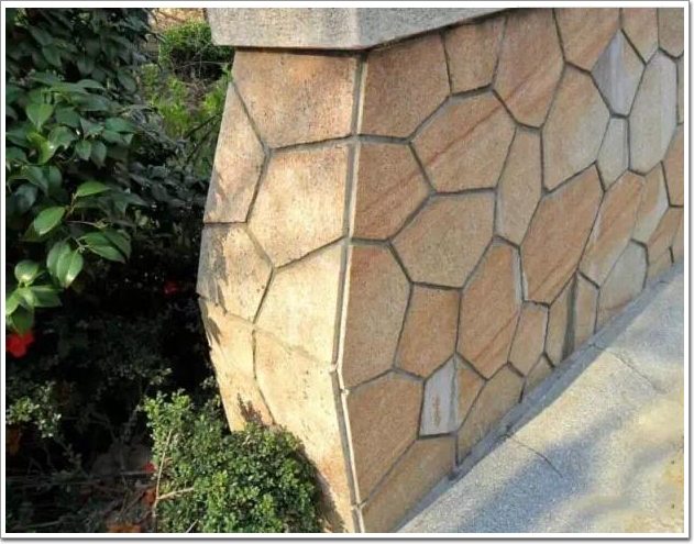 2、石材的大小適中,控制在300mm~500mm間,每個節點的石材數量按不超過3塊處理,石材間的縫隙控制均勻統一,每1m2內縫寬誤差控制在2mm內(或按設計要求);轉角的處理參考右圖做法(或按設計要求)