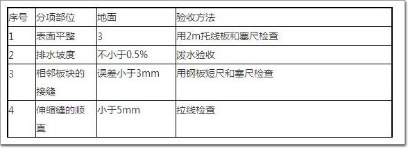 2、地面鋪裝坡度符合設計要求(并最小不少于0.3%),不倒泛水,無積水,與排水(詞條“排水”由行業大百科提供)口結合處嚴密牢固。
