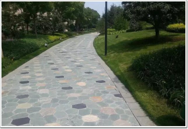 6、碎拼花崗石地面顏色協調,間隙適宜美觀,板塊大小適中,基本以不規則五邊型為主,每個接縫點按不超過三塊石材為宜,無裂縫和磨紋,表面平整。