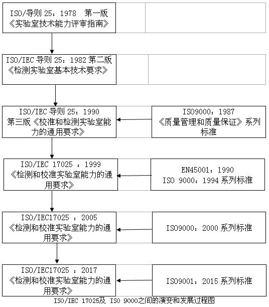 ISO/IEC 17025標準是由國際標準化組織/國際電工委員會制定的實驗室管理標準,該標準的前身是ISO/IEC導則25。發(fā)展至今已經(jīng)經(jīng)歷了6個版本,目前最新版本為ISO/IEC17025:2017。在轉版的過程中標準得到了不斷完善,從圖中可以看出,從第二個版本就已經(jīng)開始考慮ISO9001標準的內容,隨后逐漸加強兩標準的兼容性,強調管理體系的作用,要求不斷地改進管理系統(tǒng)的能力,以最大限度地滿足廣大客戶的需要,特別是對檢測校準實驗室技術能力方面提出了全面、科學、系統(tǒng)的要求。