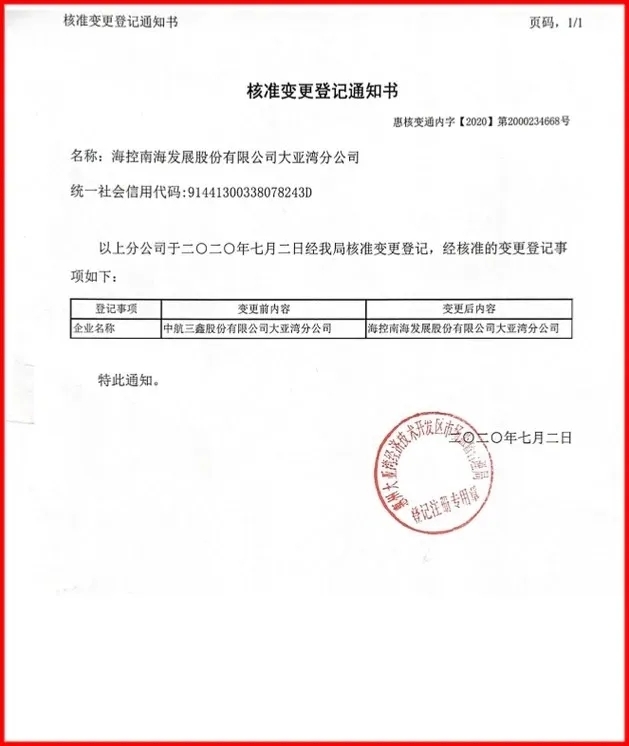 2020年7月10日,海控南海發展股份有限公司大亞灣分公司發布更名通知,由于公司所屬上市集團公司“中航三鑫股份有限公司”從2020年06月17日起變更登記為“海控南海發展股份有限公司”,所以從2020年07月02日起,公司名稱也由原來的“中航三鑫股份有限公司大亞灣分公司”變更登記為“海控南海發展股份有限公司大亞灣分公司”,原公司“ 中航三鑫股份有限公司大亞灣分公司”的全部業務由“ 海控南海發展股份有限公司大亞灣分公司”繼續經營。7月10日起,公司所有對內及對外文件、賬號、稅號等全部使用新公司名稱。公司更名后,業務主體和法律關系不變,原簽訂的合同繼續有效,原有的業務關系保持不變。