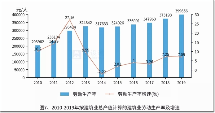 建筑業企業單位數量增加,勞動生產率創歷史新高。截至2019年底,全國共有建筑業企業單位數[1]為103,814個,比上年增加8,414個,增速為8.82%,比上年增加了0.5個百分點,增速連續四年保持增長。2019年,按建筑業總產值計算的勞動生產率為399,656元/人,比上年增長7.09%,增速較上一年下降了0.16個百分點,勞動生產率水平創歷史新高。