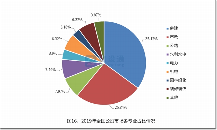 房建、市政項目招標量接近六成。2019年,各專業平均招標數量為84,166個。房建項目招標數量最多,占招標總量的35.12%。市政項目緊隨其后,占招標總量的25.84%。其他專業項目招標量占比均不足10%,其中電力、園林綠化以及其他專業占比均不足4%。