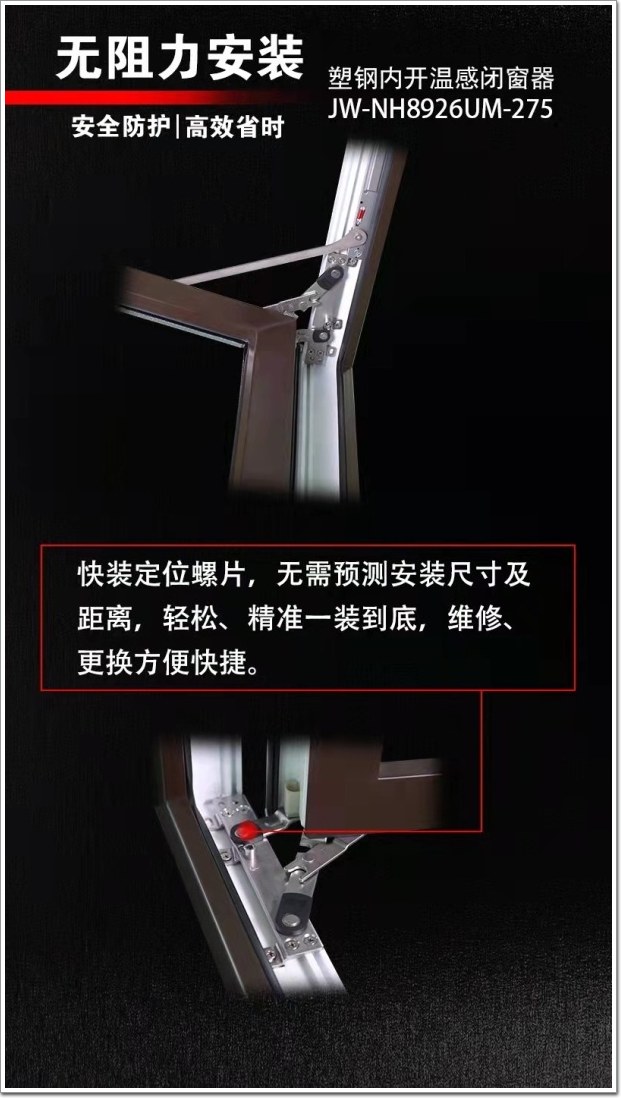 高效便捷,安全防護|塑鋼內開溫感閉窗器JW-NH8926UM-275無阻力安裝,安全防護,高效省時。快裝定位螺片,無需預測安裝尺寸及距離,輕松、精準一裝到底,維修、更換方便快捷。
