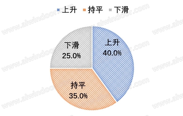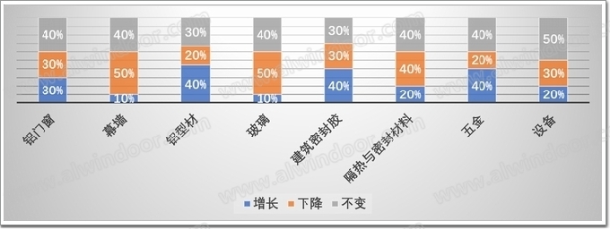 其中,鋁型材有接近一半的企業預估是上升的,其它的企業,認為上升的基本上都保持在20%左右,而幕墻企業中上升的比例最少,僅占比10%;同時玻璃和設備相對來說不太樂觀,有接近一半企業是下降。