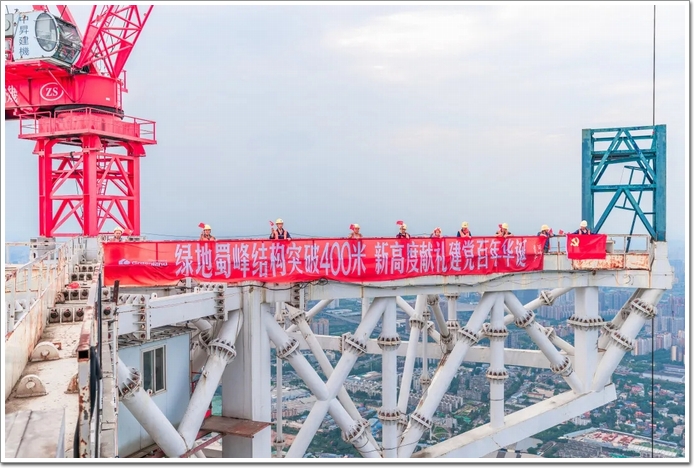新高度,獻禮建黨百年華誕!2021年6月30日,綠地蜀峰468突破400米高度發布會,在成都綠地中心圓滿舉行。隨著核心筒第89層豎向結構澆筑完成,綠地蜀峰468項目建設正式突破400米,向世界宣告成都新高度的誕生。