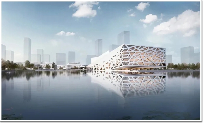 外立面設計靈感源自中國圖案冰裂紋立面,提取自中國剪紙和余杭滾燈元素,結合白色不規則外墻幕墻系統,立面干凈純潔,室內與室外具有密切的互動空間關系;正立面俯瞰湖面、公園,使其成為大型露天劇場的一部分。