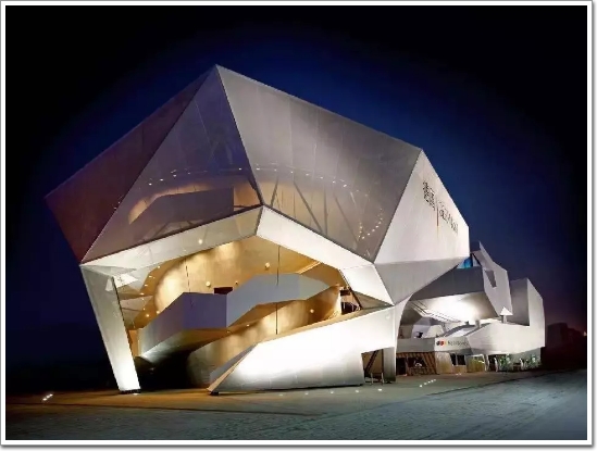 建筑外墻采用的是網狀的新穎建筑材料,遮陽節能達到21%,設計師通過在織物的表面做噴繪把展館外形打造出色彩斑斕的效果,既立體又通透。