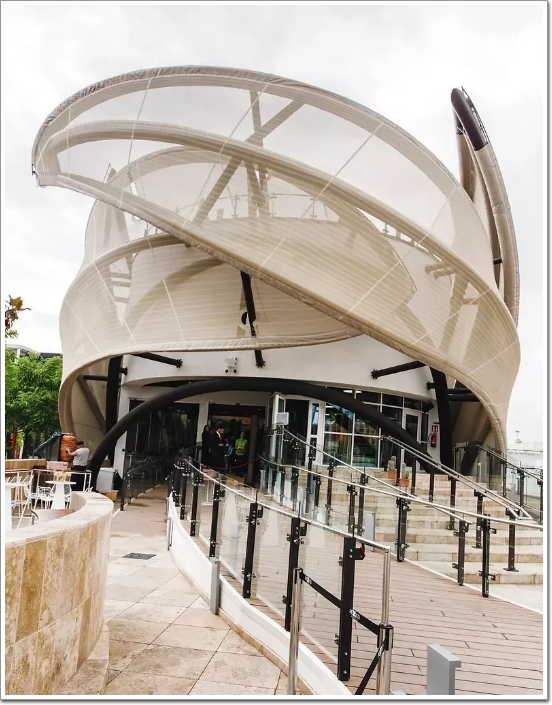 織物幕墻的膜材料,是一種在聚酯纖維編織成的基布上涂敷PVC(聚氯乙烯)樹脂而形成的復合材料,非常的具有技術含量,其曲面可以隨著建筑師的設計需要任意變化,結合整體環境,建造出標志性的形象工程。