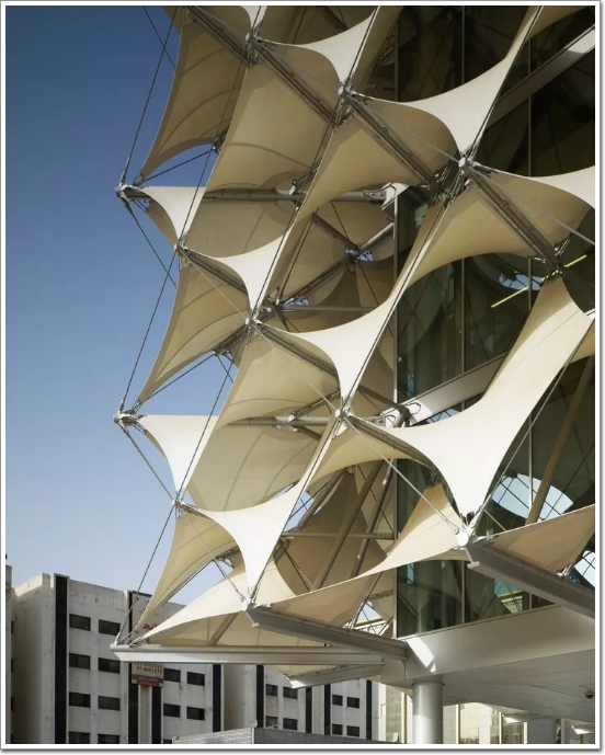 如下圖案例中所示,立面外表皮是由長菱形的紡織物組成的,這些白色薄膜通過立體的帶拉伸力的鋼絲繩結構支撐起來,不但具有遮陽的功能,而且用一種新的現代科技的方式,重新詮釋了阿拉伯帳篷結構的傳統。