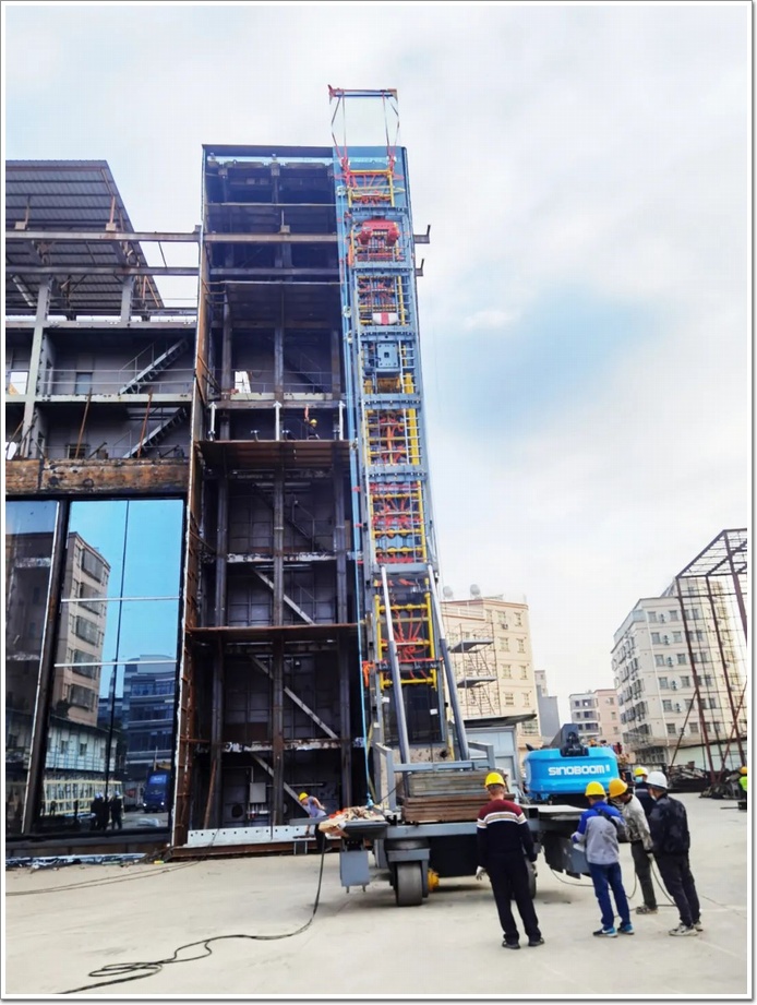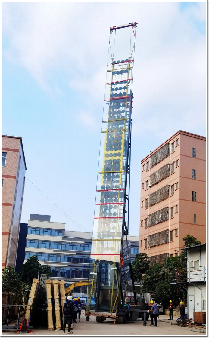 針對這項“超級幕墻”工程,江河幕墻團隊在周密考慮安全系數的基礎上,憑借豐富的施工經驗和先進的施工技術,聯合安裝隊創新改進出用來運輸、移動大玻璃的安裝車。