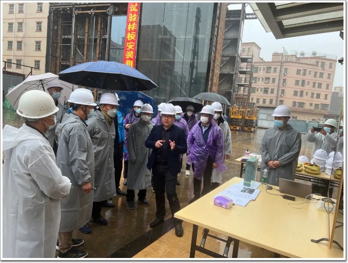 此次活動,廣州江河董事長戴竣親自帶隊組織市場、設計、技術、項目等部門管理人員及業務骨干50余人前往現場觀摩,學習和借鑒廣商中心項目的創新技術,了解項目施工中的重難點及解決措施和超大幕墻從生產、運輸到安裝的全過程。