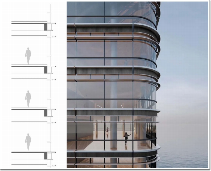 建筑造型以層疊的水平線條為主表現(xiàn)力,柔美的線條在與珠江水相呼應,強調(diào)水平向的辦公空間布局,結(jié)合建筑豎向交通北置實現(xiàn)南向辦公空間的最大化;線條節(jié)節(jié)上升,在塔樓頂部設置局部兩層通高的企業(yè)展廳,俯瞰珠江,遠眺廣州塔。